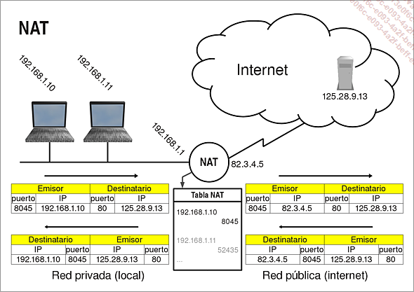 NAT consiste en reescribir la cabecera IP de un paquete que viaja de una red pública a una red privada y viceversa. Básicamente es lo que hace un router doméstico cuando desde un equipo local queremos salir a Internet. En los equipos locales tenemos IPs privadas y es necesario tener una IP pública para salir a Internet. El router modifica los paquetes enviados desde los equipos locales y enmascara su dirección poniéndole la pública.