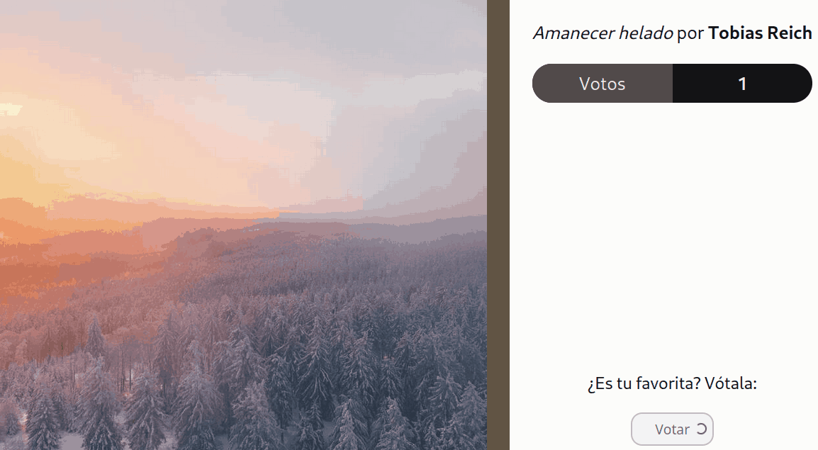 Puedes ver a continuación una captura del momento en que se está enviando el voto a una fotografía con 0 votos previos, el botón se encuentra en estado de carga pero el voto ya se ha sumado de forma optimista al contador: