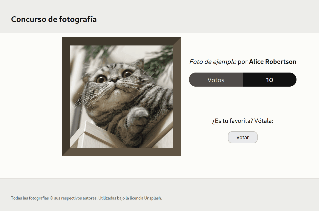 /: raíz de la aplicación, que mostrará el índice de fotos/photos/:id: página individual para cada fotografía/photos/:id/voted: página que se mostrará cuando se haya votado por una foto