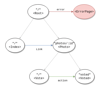 const router = createBrowserRouter(createRoutesFromElements( <Route path="/" element={<Root />}> <Route index element={<Index />} /> <Route path="photos/:imageId" element={<Photo />}> <Route index element={<Vote />} /> <Route path="voted" element={<Voted />} /> </Route> </Route> ))
