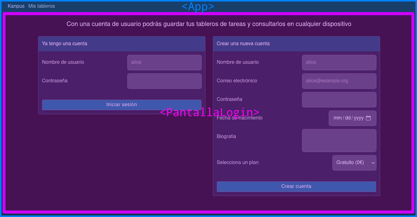Vamos a separar las rutas de inicio de sesión y de registro para trabajar mejor con React Router, así como para mostrar una interfaz menos compleja. Para ello, tendremos una ruta /cuenta donde se renderizará el componente PantallaAcceso que tienes a continuación: