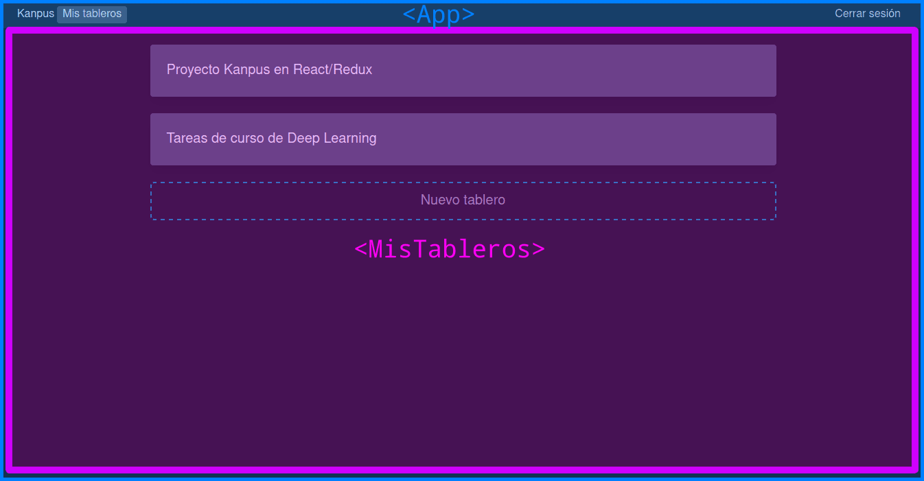 Una vez que una persona inicia sesión con su cuenta de usuario, lo apropiado es cargar y mostrar la información relativa a esta cuenta, en nuestro caso, los tableros de listas de tareas. Previamente, en la función de carga de páginas protegidas, hemos devuelto un objeto con el campo user que indica dicha cuenta y, además, la ruta asociada tiene un identificador “sesion”. Podemos acceder a estos datos mediante el hook useRouteLoaderData que nos permite, indicando el identificador como parámetro, acceder a lo que haya devuelto cualquier función de carga incluso si no es la que corresponda a la ruta actual.