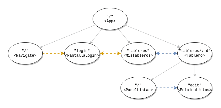 Si traducimos la lista de caminos a un grafo, podría tener el siguiente aspecto. Se han añadido los nombres de los componentes que vamos a implementar en cada ruta y se observa mejor que unas rutas parten de otras previas: