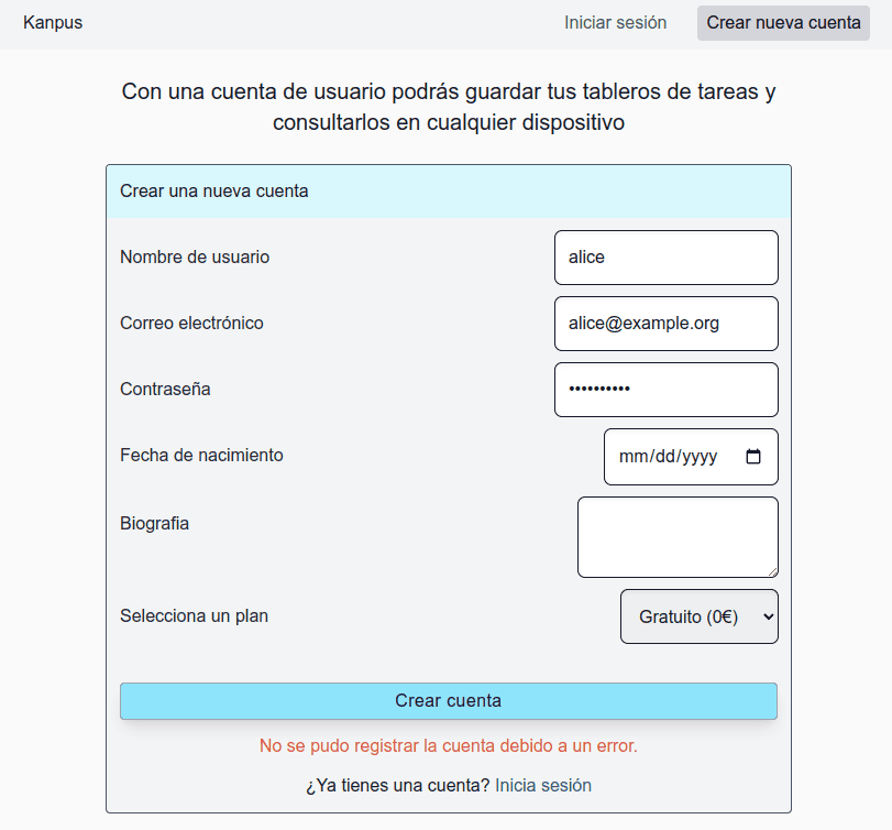 const FormularioRegistro = () => { const registroFallido = useActionData()?.registroFallido // ... return ( <Form method="post"> <fieldset> <Tarjeta top="Crear una nueva cuenta" bottom={<> <BotonPrimario type="submit" disabled={Object.values(errores).some(v=>v)} className="w-full">Crear cuenta</BotonPrimario> {registroFallido && <p className="text-center text-red-500 pt-3"> No se pudo registrar la cuenta debido a un error. </p>} <p className="pt-3 text-center"> ¿Ya tienes una cuenta? <Link to="../acceder" className="text-cyan-800 dark:text-cyan-300"> Inicia sesión </Link> </p> </>}>
