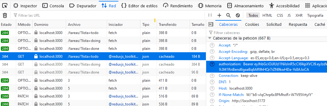 El último paso es cerciorarnos de que las peticiones al servidor contienen la cabecera con el JWT ya que, de lo contrario, el servidor las podría rechazar al no estar autenticadas. La convención habitual es indicar el token en el formato Bearer {token} en la cabecera Authorization, por lo que es la forma en que la vamos a implementarlo.