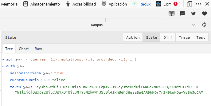 Tras haber incluido estas acciones de Redux en el flujo de inicio y cierre de sesión, podrás ver en las herramientas de desarrollo de Redux cómo se almacena el token de la cuenta que inicia sesión: