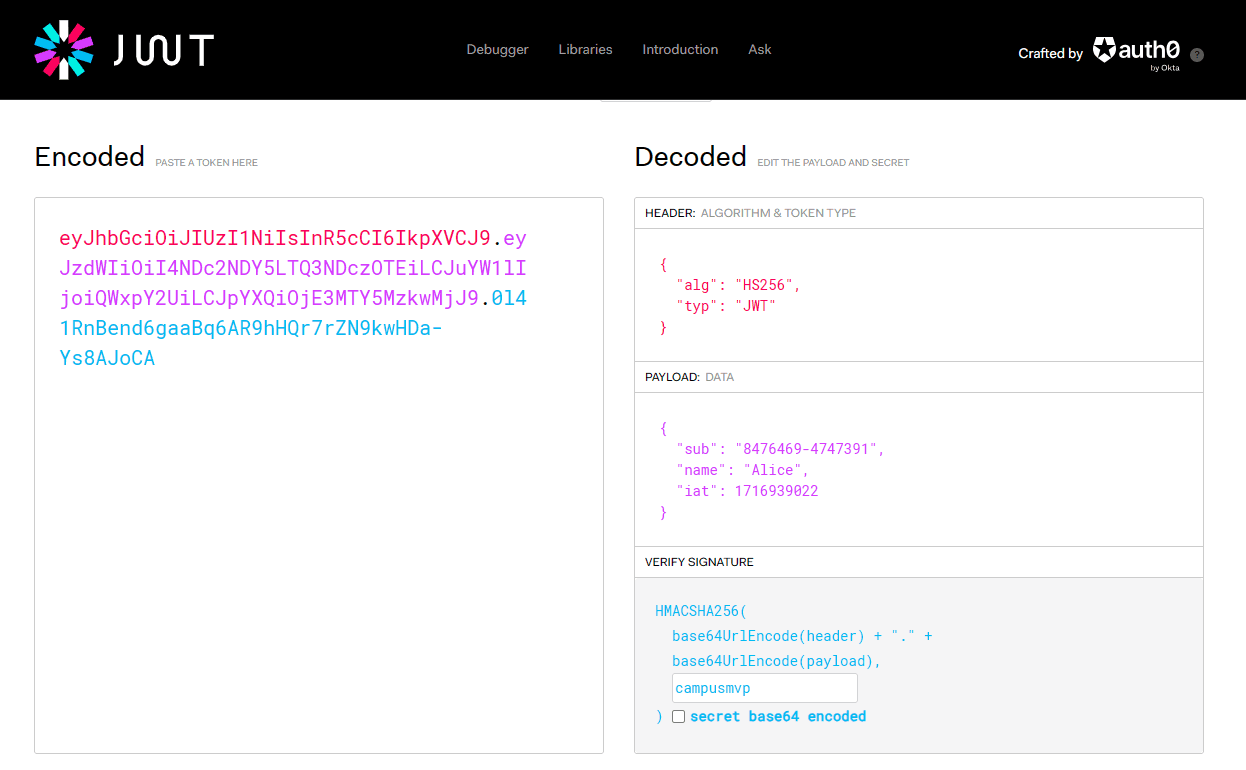 Por su parte, la firma es la concatenación de las dos primeras partes de la cadena, y está cifrada en este caso con el secreto campusmvp, que sería necesario para su decodificación por parte del servidor. Este secreto es una clave privada de cifrado que solo conoce el servidor y se utiliza para verificar que el token enviado por el navegador es válido y no se ha modificado (ya que si se hubiese modificado en modo alguno la firma no coincidiría).