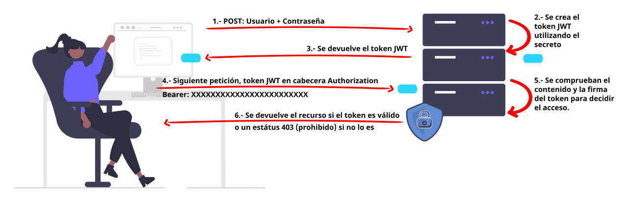 El proceso de trabajo con los tokens JWT es el que se muestra en la siguiente figura: