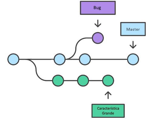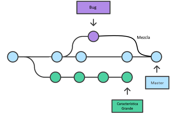 Al mismo tiempo, la otra rama, en la que se está desarrollando la característica grande, puede haber evolucionado por su cuenta, totalmente ajena a los cambios que se han hecho en otras ramas, como la que hemos utilizado para solucionar el bug, hasta que la mezclemos con el master u otra rama.