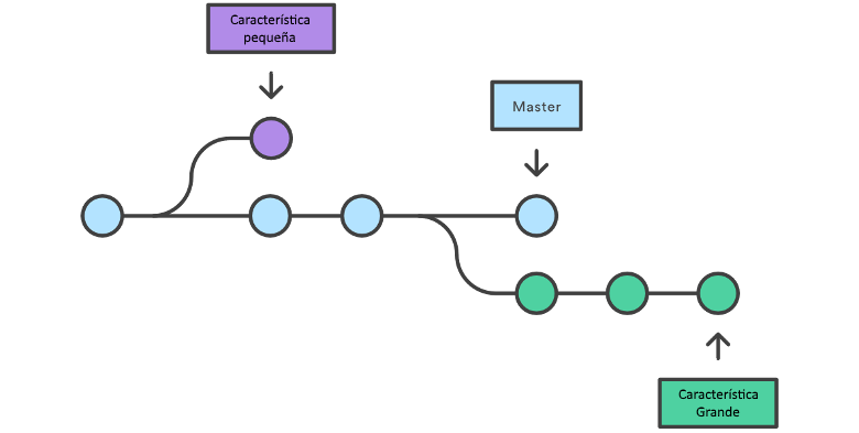 Un commit no puede apuntar hacia más de un commit anterior, aunque un commit sí que puede recibir referencias de más de un commit, como se ve en la figura anterior en las ramas. Por ejemplo, el primer commit de master, a la izquierda, recibe referencias desde otros dos commits, el siguiente en master y el primero de la rama llamada “Característica pequeña”.