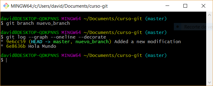 Fíjate especialmente en cómo coincide en el mismo commit tanto el HEAD, como el master, como la rama nueva. Pero el hecho de que crees la rama NO quiere decir que puedas trabajar ya en ella.