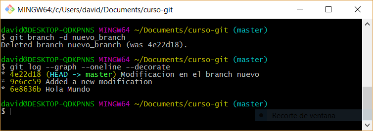 Como ya hemos terminado el desarrollo y lo hemos mezclado desde la rama que estábamos utilizando, no es necesario mantener esa rama local. Para eliminarla sólo debemos ejecutar: