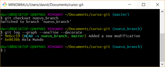 Compara ahora las dos últimas imágenes y fíjate especialmente en el puntero HEAD (el que se muestra entre paréntesis en color azul, al final de cada línea de comandos), para ver a dónde está apuntando. Esto indica que estamos en la nueva rama que hemos creado, y que podemos empezar a trabajar en ella usando el flujo que hemos aprendido antes, git-add y git-commit.