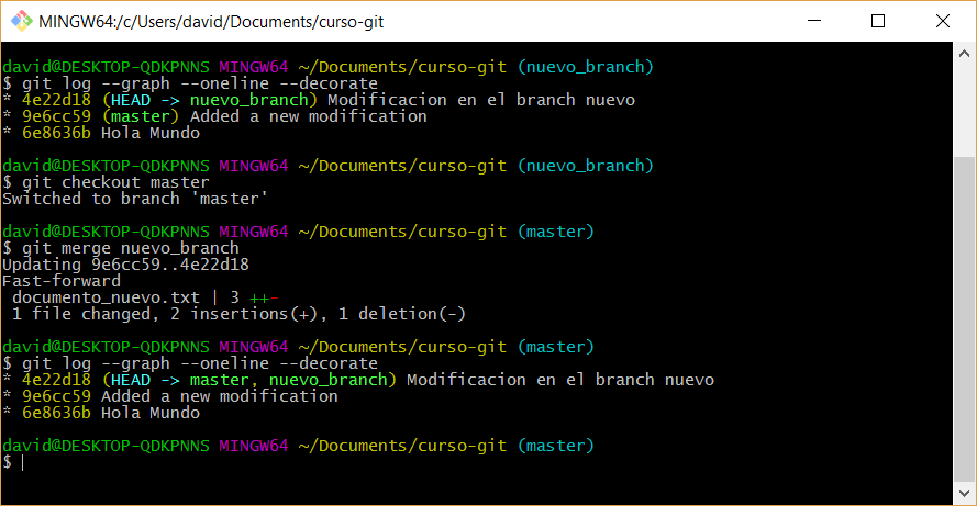 git checkout master: necesario para ir al master, ya que es la rama que vamos a actualizar.git merge nuevo_branch: hacemos unmergede la rama local en el master.