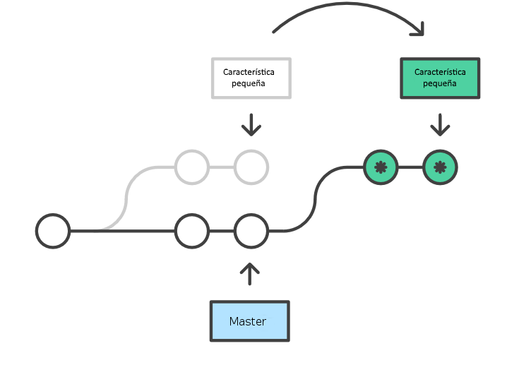 Como puedes ver, entre estas dos ramas hay varios commits de gente (o nosotros mismos) que ha ido actualizando código. Pongámonos en la siguiente situación: estamos desarrollando algo en la rama Característica Pequeña, pero para continuar necesitamos de un desarrollo que ha subido un compañero a master, que va por delante de nosotros. Una situación bastante común.