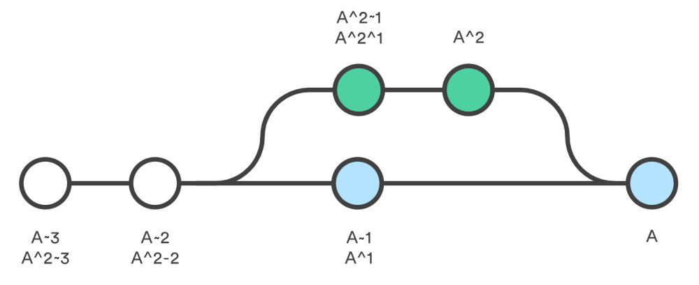 El símbolo ~ siempre sigue al primer “padre” del commit referenciado (el HEAD en nuestro ejemplo). Pero si existe más de una rama que parte de un commit, podemos movernos por éstas usando el símbolo ^ para indicar el orden de las mismas. Por ejemplo: HEAD^2 obtendría el primer commit de la segunda rama que parte del commit en el que está HEAD en ese momento.
