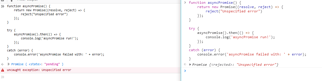 function asyncPromise() { return new Promise((resolve, reject) => { throw ("Unspecified error") }); } try { asyncPromise().then(() => { console.log('asyncPromise run!'); }); } catch (error) { console.error('asyncPromise failed with: ' + error); }