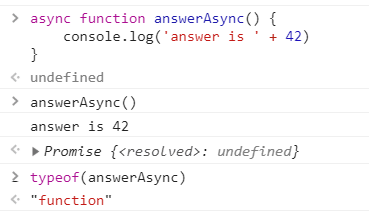 function answerAsync() { const pr = new Promise((resolve, reject) => { console.log('answer is 42') resolve() }); return pr; }