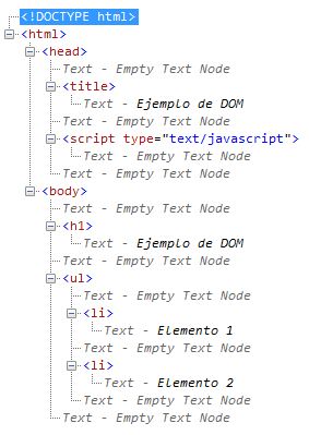 <!DOCTYPE html> <html> <head> <title> </title> <style type="text/css"> .rojo { color: red; } .verde { color: green; } </style> </head> <body> <h1 class="rojo">Ejemplo de DOM</h1> <ul id="lista"> <li>Elemento 1</li> <li>Elemento 2</li> </ul> <script type="text/javascript"> // Localizar por id alert(document.getElementById("lista").nodeName); // Localizar por etiqueta var eltosLista = document.getElementsByTagName("li"); for (var i = 0; i < eltosLista.length; i++) { alert(eltosLista[i].innerHTML); } // Localizar por etiqueta limitando la región var miLista = document.getElementById("lista"); alert(miLista.getElementsByTagName("li")[0].innerHTML); // Localizar por nombre de clase var rojos = document.getElementsByClassName("rojo"); for (var i = 0; i <rojos.length; i++) { rojos[i].className = "verde"; } // Localizar por selectores CSS var ultimoDeLaLista = document.querySelector("ul > li:last-child"); alert(ultimoDeLaLista.innerHTML); </script> </body> </html>