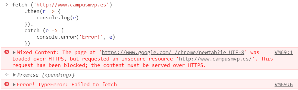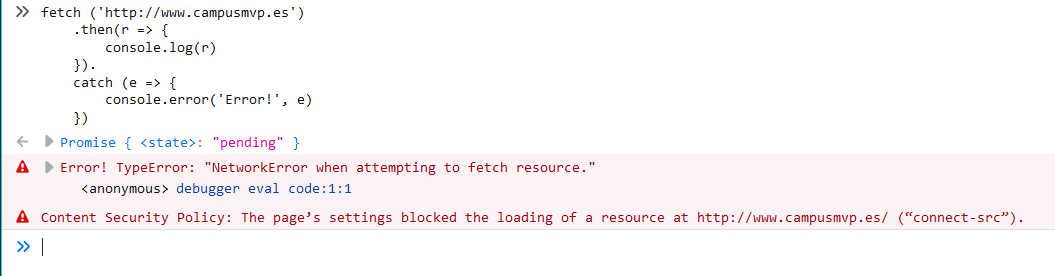 fetch ('http://www.campusmvp.es') .then(r => { console.log(r) }). catch (e => { console.error('Error!', e) })