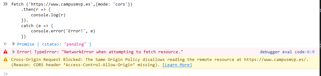 fetch ('https://www.campusmvp.es',{mode: 'cors'}) .then(r => { console.log(r) }). catch (e => { console.error('Error!', e) })