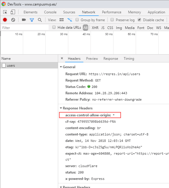 Este código funciona. Si miramos la pestaña de red del navegador, en la respuesta de la petición, encontramos la cabecera ACAO con el valor “*”, que significa que cualquier origen es válido: