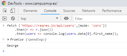 fetch ('https://reqres.in/api/users',{mode: 'cors'}) .then(r => r.json()) .then(users => console.log(users.data[0].first_name));