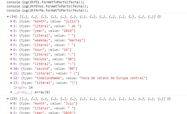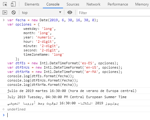 var fecha = new Date(2019, 6, 30, 16, 30, 0); var opciones = { weekday: 'long', month: 'long', year: 'numeric', hour: '2-digit', minute: '2-digit', second: '2-digit', timeZoneName: 'long' }; var dtfEs = new Intl.DateTimeFormat('es-ES', opciones); var dtfEnUs = new Intl.DateTimeFormat('en-US', opciones); var dtfArMa = new Intl.DateTimeFormat('ar-MA', opciones); console.log(dtfEs.format(fecha)); console.log(dtfEnUs.format(fecha)); console.log(dtfArMa.format(fecha));