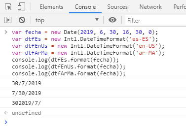 var fecha = new Date(2019, 6, 30, 16, 30, 0); var dtfEs = new Intl.DateTimeFormat('es-ES'); var dtfEnUs = new Intl.DateTimeFormat('en-US'); var dtfArMa = new Intl.DateTimeFormat('ar-MA'); console.log(dtfEs.format(fecha)); console.log(dtfEnUs.format(fecha)); console.log(dtfArMa.format(fecha));