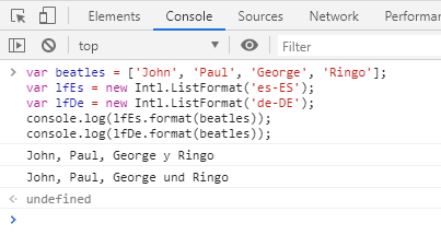 var beatles = ['John', 'Paul', 'George', 'Ringo']; var lfEs = new Intl.ListFormat('es-ES'); var lfDe = new Intl.ListFormat('de-DE'); console.log(lfEs.format(beatles)); console.log(lfDe.format(beatles));