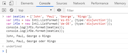 var beatles = ['John', 'Paul', 'George', 'Ringo']; var lfEs = new Intl.ListFormat('es-ES', {type:'disjunction'}); var lfDe = new Intl.ListFormat('de-DE', {type:'disjunction'}); console.log(lfEs.format(beatles)); console.log(lfDe.format(beatles));