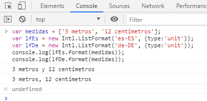 var medidas = ['3 metros', '12 centímetros']; var lfEs = new Intl.ListFormat('es-ES', {type:'unit'}); var lfDe = new Intl.ListFormat('de-DE', {type:'unit'}); console.log(lfEs.format(medidas)); console.log(lfDe.format(medidas));