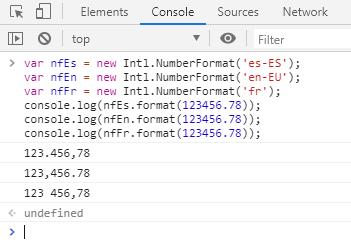 var nfEs = new Intl.NumberFormat('es-ES'); var nfEn = new Intl.NumberFormat('en-EU'); var nfFr = new Intl.NumberFormat('fr'); console.log(nfEs.format(123456.78)); console.log(nfEn.format(123456.78)); console.log(nfFr.format(123456.78));