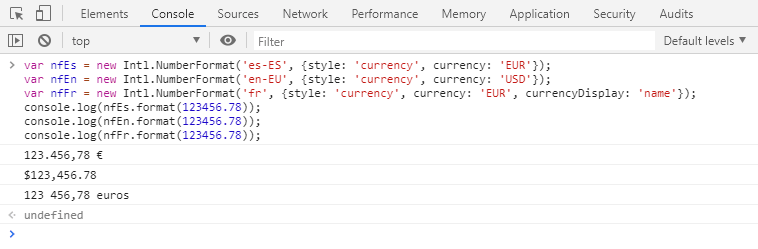 var nfEs = new Intl.NumberFormat('es-ES', {style: 'currency', currency: 'EUR'}); var nfEn = new Intl.NumberFormat('en-EU', {style: 'currency', currency: 'USD'}); var nfFr = new Intl.NumberFormat('fr', {style: 'currency', currency: 'EUR', currencyDisplay: 'name'}); console.log(nfEs.format(123456.78)); console.log(nfEn.format(123456.78)); console.log(nfFr.format(123456.78));