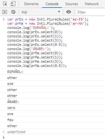 var prEs = new Intl.PluralRules('es-ES'); var prMa = new Intl.PluralRules('ar-MA'); console.log('ESPAÑOL:'); console.log(prEs.select(0)); console.log(prEs.select(1)); console.log(prEs.select(3)); console.log(prEs.select(0.5)); console.log('ÁRABE:'); console.log(prMa.select(0)); console.log(prMa.select(1)); console.log(prMa.select(3)); console.log(prMa.select(0.5));