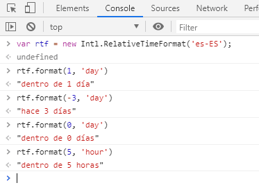 rtf.format(1, 'day') //dentro de 1 día rtf.format(-3, 'day') //hace 3 días rtf.format(0, 'day') //dentro de 0 días rtf.format(5, 'hour') //dentro de 5 horas