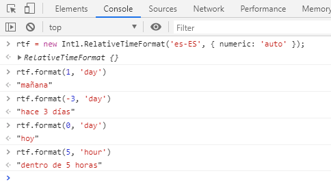 var rtf = new Intl.RelativeTimeFormat('es-ES');