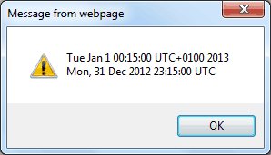 var fecha = new Date(2013,0,1,0,15); alert(fecha + "\n" + fecha.toUTCString());