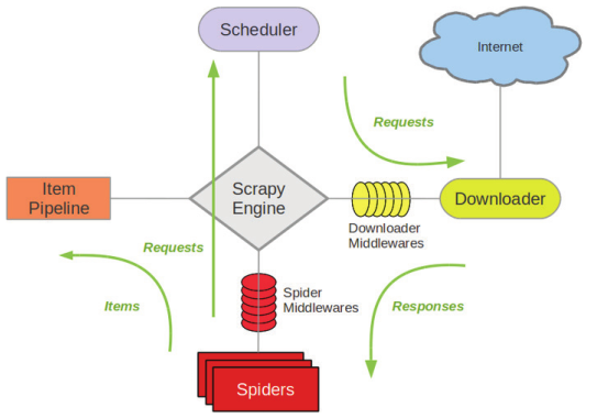 En esta imagen, puede ver una descripción general de la arquitectura Scrapy. La figura muestra en detalle cómo los componentes de la arquitectura Scrapy funcionan juntos donde el motor no se comunica directamente con los downloaders, sino que primero pasa la solicitud HTTP al scheduler o planificador.