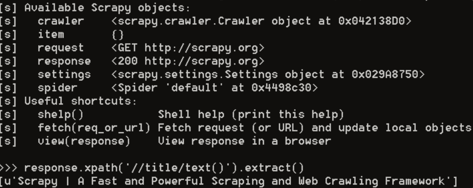 >>> fetch('http://www.scrapy.org') >>> response.xpath('//title/text()').extract() >>> ['Scrapy | A Fast and Powerful Scraping and Web Crawling Framework']