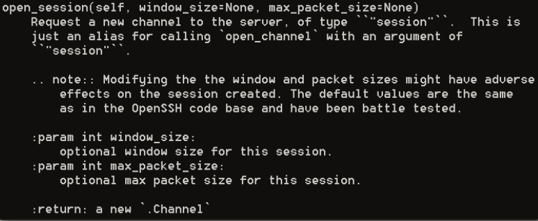 Para ello podemos utilizar el método exec_command('comando_ejecutar'), al cual le pasamos el comando a ejecutar, pero la principal diferencia con respecto al caso anterior tenemos que utilizar el método open_session() para abrir una nueva sesión en el servidor para posteriormente poder ejecutar comandos: