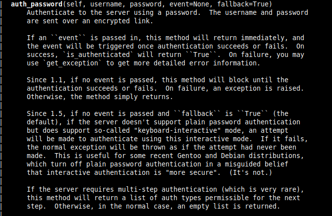 Esta clase proporciona el método auth_password() para autenticarnos con el servidor SSH a partir del usuario y password: