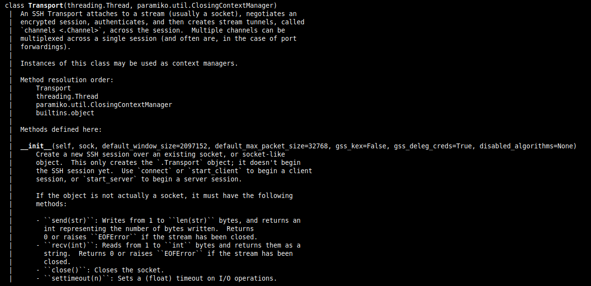 >>> import paramiko >>> help(paramiko.transport)