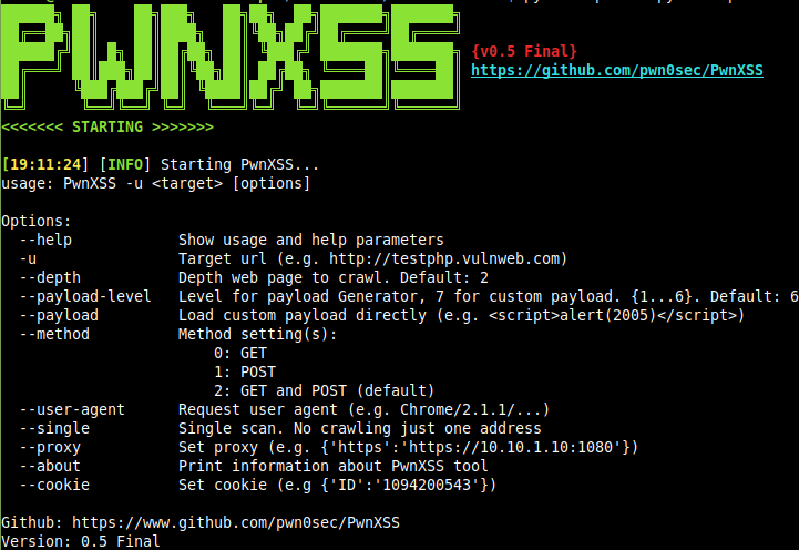 $ python3 pwnxss.py -u http://testhtml5.vulnweb.com