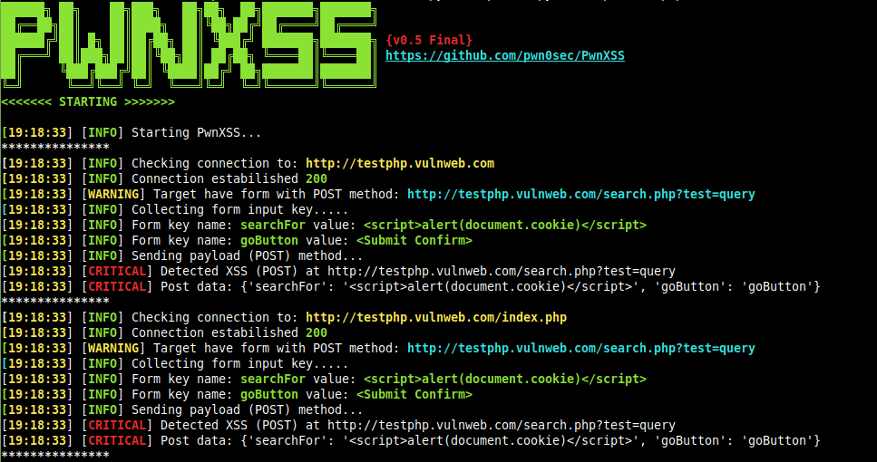 $ python3 pwnxss.py -u http://testphp.vulnweb.com
