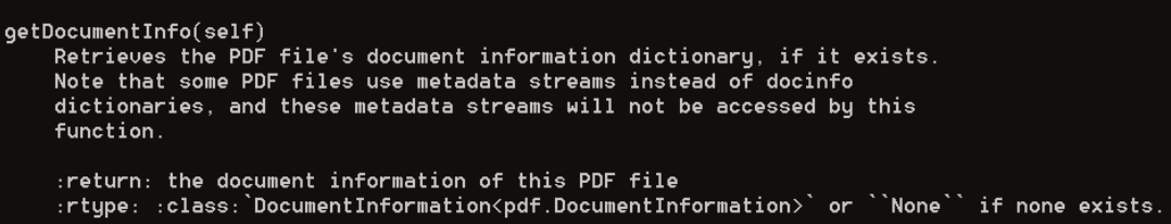 El método que podríamos utilizar para obtener la información de un documento PDF es getDocumentInfo(), que devuelve un diccionario con los datos del documento. En la siguiente imagen podemos ver una descripción de este método perteneciente a la clase PdfFileReader:
