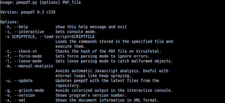 Peepdf es una herramienta de Python que analiza archivos PDF y nos permite visualizar todos los objetos incrustados en el documento. También tiene la capacidad de analizar diferentes versiones de un archivo PDF, secuencias de objetos y archivos cifrados, así como modificar y ofuscar archivos PDF.