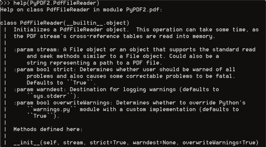 Si consultamos la ayuda del módulo, vemos que hay varias clases definidas, nosotros nos centraremos en la clase PdfFileReader.