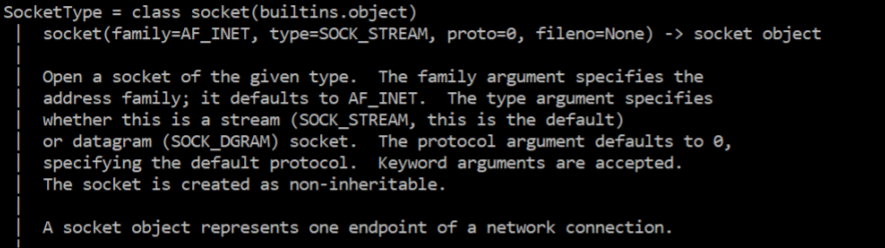 Estos argumentos representan las familias de direcciones y el protocolo de la capa de transporte. Dependiendo del tipo de socket, los sockets se clasifican en sockets de flujo (socket.SOCK_STREAM) o sockets de datagramas (socket.SOCK_DGRAM), en función de si el servicio utiliza TCP o UDP. socket.SOCK_DGRAM se usa para comunicaciones UDP, y socket.SOCK_STREAM para conexiones TCP.