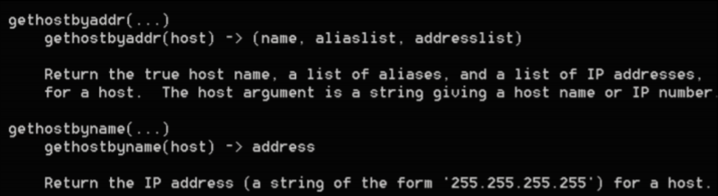 gethostbyaddr(dirección): nos permite obtener un nombre de dominio a partir de la dirección IP.gethostbyname(hostname): nos permite obtener una dirección IP a partir de un nombre de dominio.